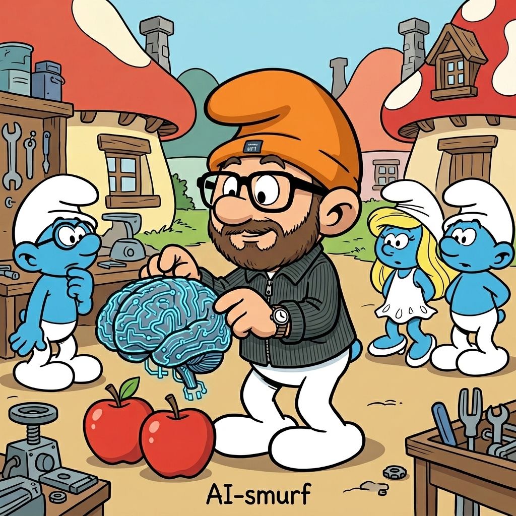 THE CHARACTER: Three apples tall, blue skin. Their specific features mapped onto Smurf anatomy. Pose reflecting personality. Carrying object or tool that defines them. Unique Smurf identity: "[Namn]-smurf" or role-based name.