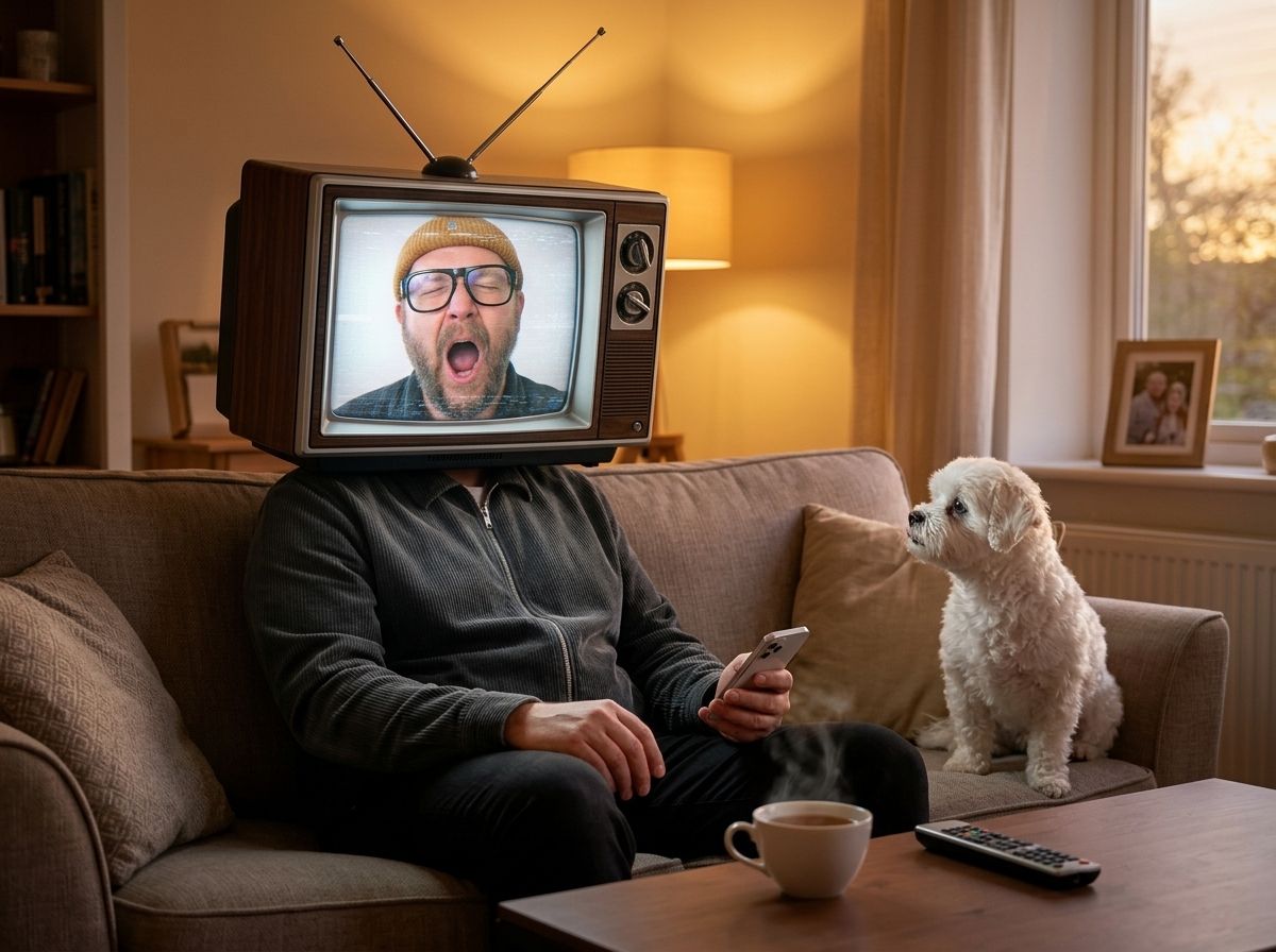Photorealistic photograph. The person from the reference image sitting on a sofa in a completely ordinary living room. Evening light, coffee table, remote control, potted plant. Everything normal except: their head is a vintage television set from the 1980s. Bulky, wood-paneled, antenna on top. On the screen: their own face, live, moving, showing their expression in real-time. Currently watching something off-camera, slightly bored, occasionally glancing at their phone which they hold in normal human hands. The TV-face yawns. Static flickers briefly between emotions. The antenna adjusts itself slightly when they have a thought. A cup of tea sits beside them, steam rising. The dog on the armrest watches the screen with the same attention it gives any TV.
