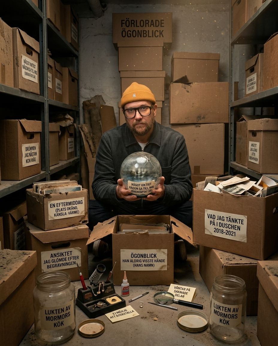 The person from the reference image sits on the floor between shelves, surrounded by open boxes. These moments are damaged, incomplete, or lost. They hold a cracked glass sphere containing a blurry scene, impossible to make out. Label water-damaged but readable: "NÅGOT VIKTIGT NÅGON SA TILL MIG (OBEKRÄFTAT ÅR)."