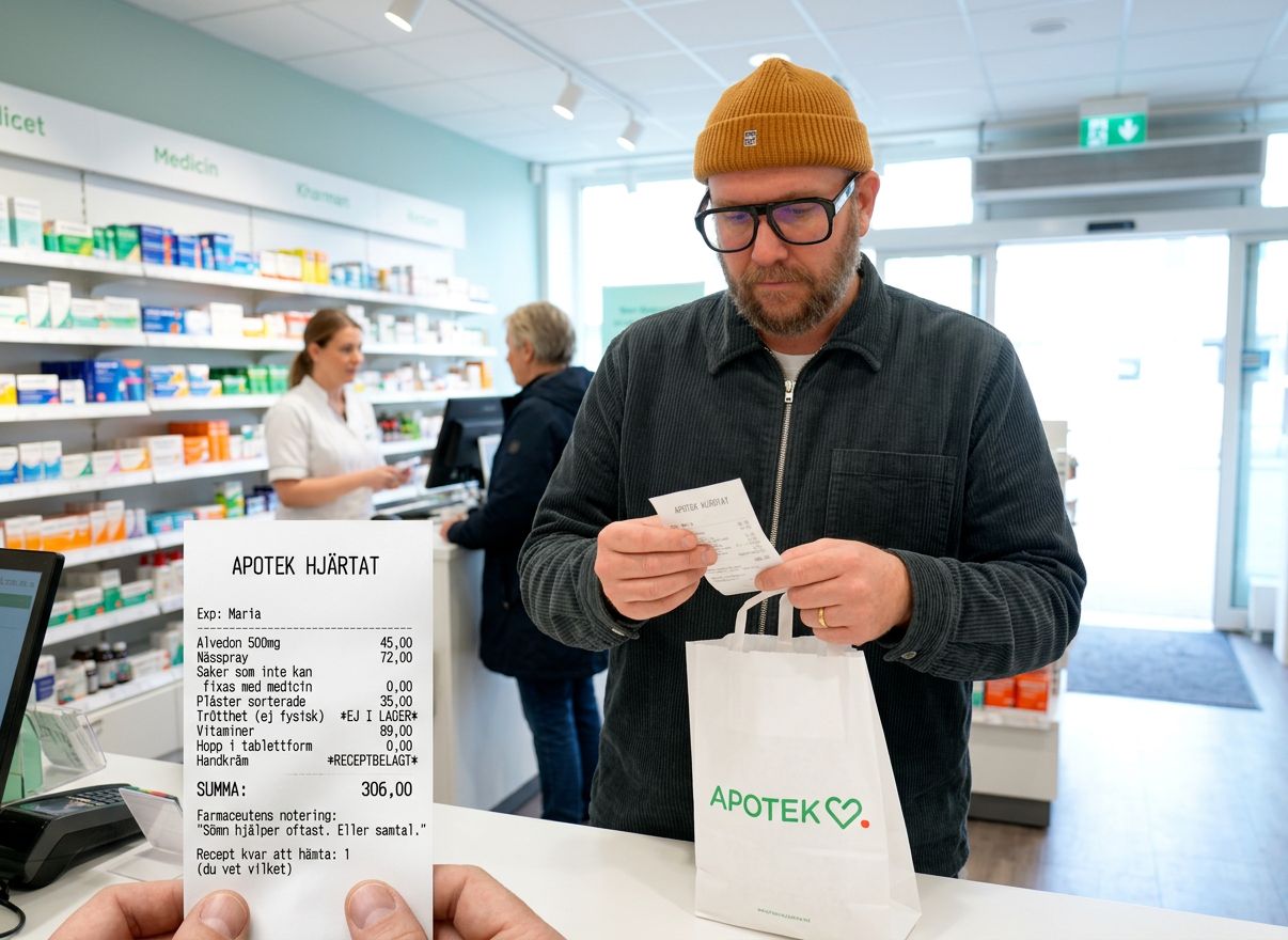 Photorealistic photograph. The person from the reference image standing at an pharmacy counter, white bag with purchase, reading the receipt. Harsh pharmacy lighting, shelves of products behind.