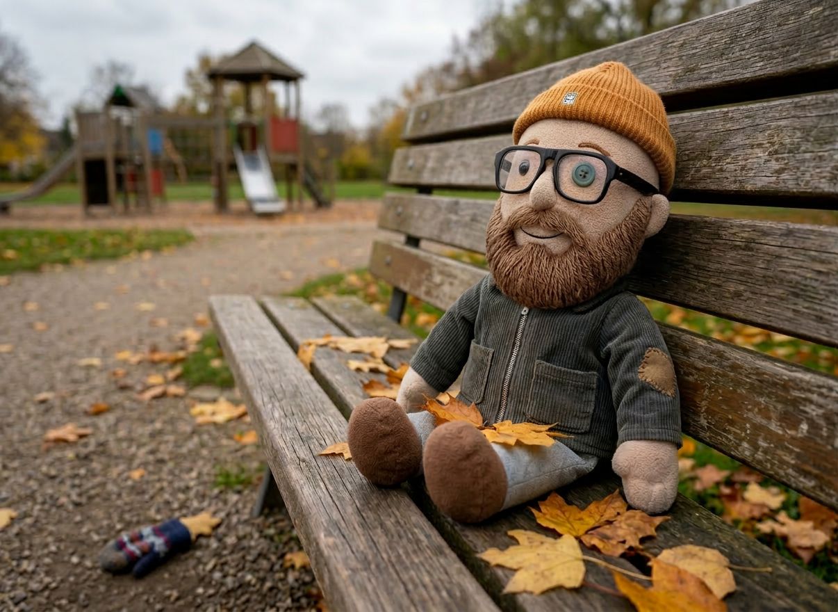 Photorealistic photograph of a plush toy version of the person from the reference image, forgotten alone on a park bench in autumn.